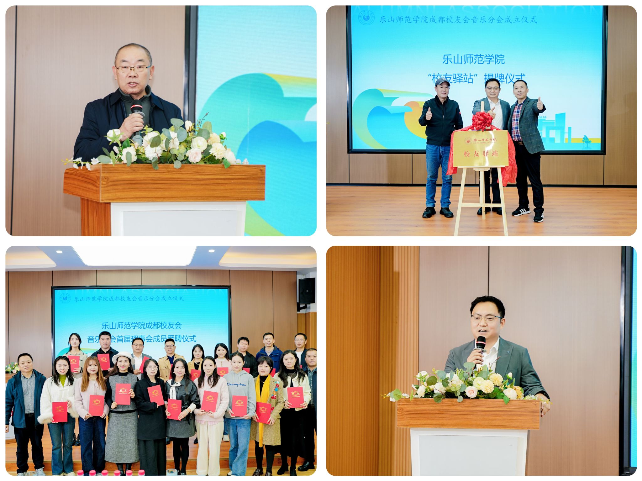 校友事务办公室主任、校友总会秘书长杜理才宣读《关于同意成立成都校友会音乐分会及通过第一届理事会成员名单的批复》。音乐分会筹备组成员、音乐学院原班子成员邹大勇与校友总会常务理事李东共同为成都校友会音乐分会首届理事会成员颁发聘书。音乐学院党委书记宋军、院长周特古斯和音乐分会会长周松林共同为乐山师范学院“校友驿站”揭牌。从此,天南地北的校友在成都这座城市有了一个温暖的港湾,这里将永远有一份属于乐师人的归属感。
