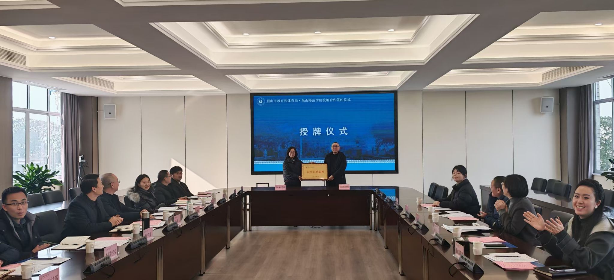 在签约仪式上,我校教师教育学院院长黄宽娜向眉山市教体局师训中心授牌“乐山师范学院实习实践基地”。